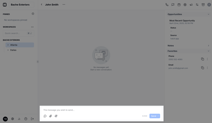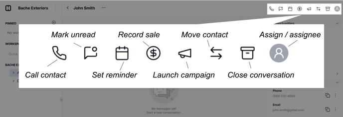 - Change contact method: The first symbol shows which medium you're using to communicate with this contact. By default, your responses in Hatch will come from whichever medium your contact has used to contact you, but you can also switch in the middle of a conversation. A speech bubble means you're drafting a SMS message, a mail icon means you're writing an email, and the Yelp logo means you're going to send a message via Yelp.