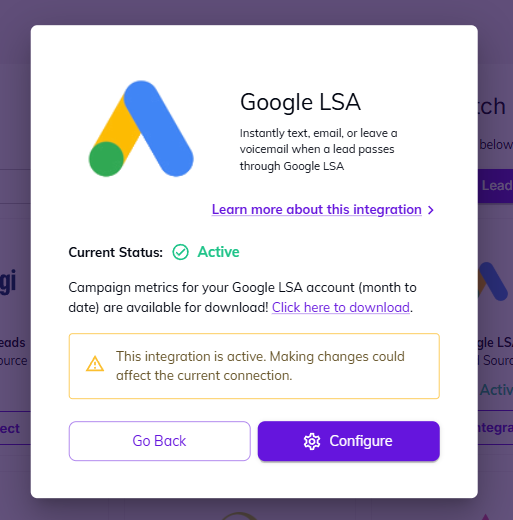As a required by Google, Hatch is also providing downloadable reporting metrics for your LSA campaigns. These metrics include clicks on your ad, impressions, and conversions. You can download the report by navigating to the app marketplace and clicking View Integration. If your LSA integration is active, you will see a download link: