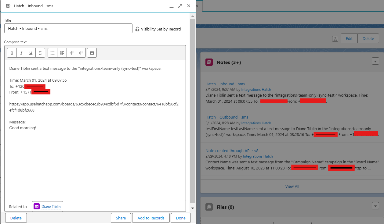 - When a Hatch user sends an outbound communication to a contact