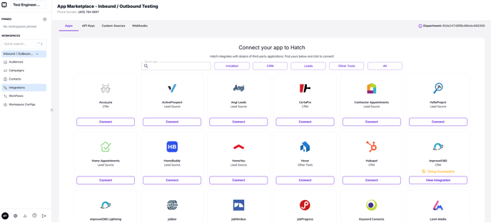 The Hatch App Marketplace contains a number of prebuilt integrations for you to use. If you are a Hatch Manager, you can explore the apps that are popular amongst our users including CRMs, lead sources, and more.