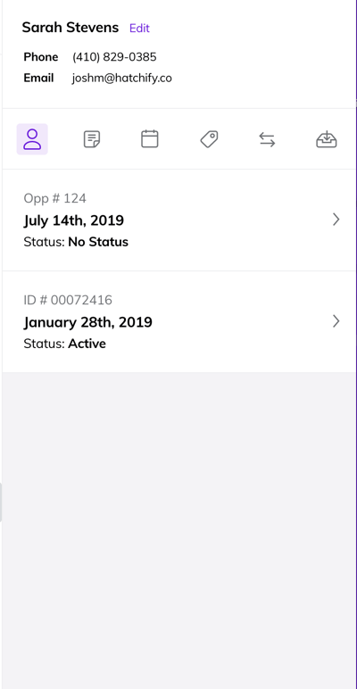 On the Contacts Page, contacts will show the first and last name of the contact as well as the most recent Status and Created Date. If you open a contact card, you can find all the information that was pulled in through the import in the Contact Details.
