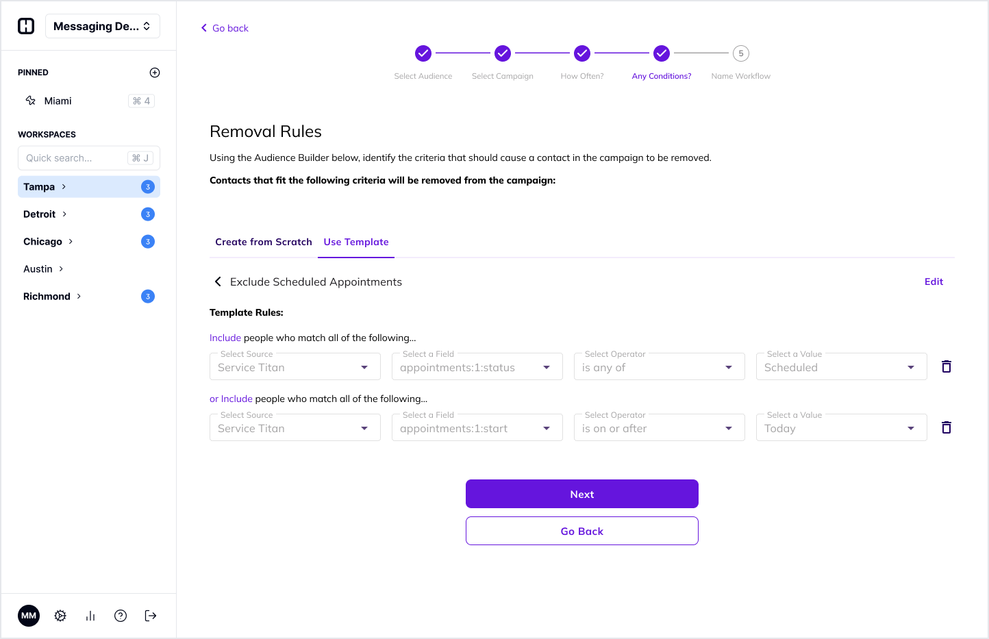 For example, you may want to remove contacts from any Speed-to-Lead Campaign if the Contact has an Appointment starting in the next 7 days. You can create a Removal Rule Template called "Remove Upcoming Appointments" with a condition that checks for contacts with Appointments between 0 and 7 days in the future, and apply it to all of your Speed-to-Lead related workflows. If at any point in time you want to increase the window to remove people with appointments in the next 14 days, you only need to make that change to the template, and the updates will apply everywhere!