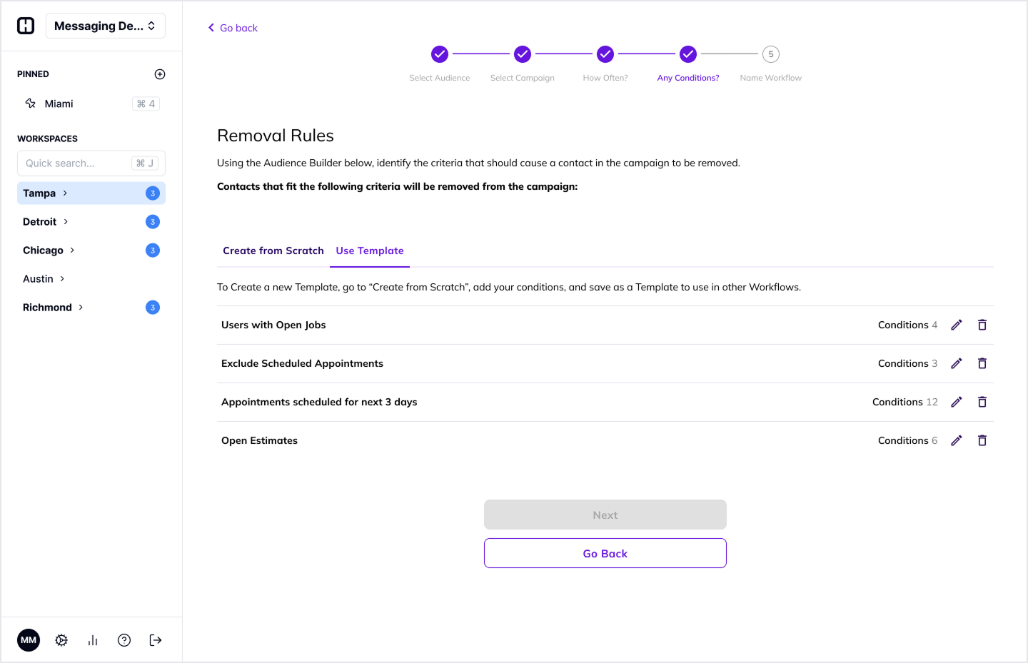 When creating or editing a Workflow, Step 4 allows you to set Removal Rules. Once you've applied a set of conditions in the "Create from Scratch" tab, you'll see a "Save as Template" button in the top right. Once you click Save, you'll set a Name for this template and your done! This Workflow will already be using your newly created template.