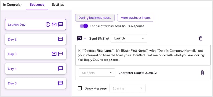 Due to TCPA rules, all SMS messages in a Hatch Campaign sequence must include the [[Details Company Name]] snippet as a form of Sender-Identification.