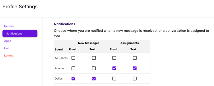 In this example, the user will be notified over email and text for any new messages to the Dallas salesboard, and by email and text for any conversations assigned to them on the Atlanta salesboard - If you can't select text notifications, navigate over to the General tab and add the cell number where you'd like to receive notifications