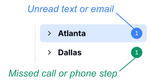 Hatch's sidebar shows you when a given salesboard has an unread message, or when a call step is required for a campaign with a call step. Text and email notifications are blue, while phone-related notifications are green.